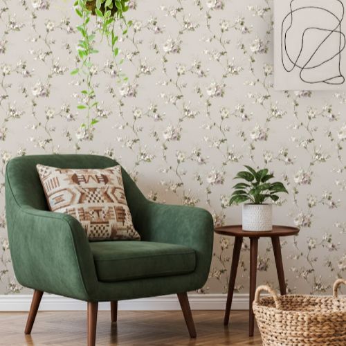 Soft green vines wind across the surface, creating a tranquil, nature-inspired pattern that brings a refreshing and peaceful feel to any room. The delicate foliage motif adds depth and gentle movement without feeling overwhelming. With a roll size of 10.05 mtrs × 0.53 mtrs = 57 sq ft, this Floral Wallpaper Dubai option enhances living rooms, bedrooms, and relaxed lounges with calm elegance.