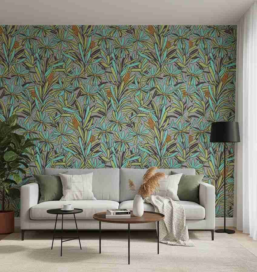 Filled with layered botanical details, this wallpaper adds energy and artistic charm to interior walls without overwhelming the space. The repeating leaf pattern creates depth and keeps the room visually engaging. Available in a 0.53 m × 10 m roll covering 57 sq ft, this botanical green wallpaper Dubai suits bedrooms, creative offices, and statement walls where a lively yet balanced look is desired.