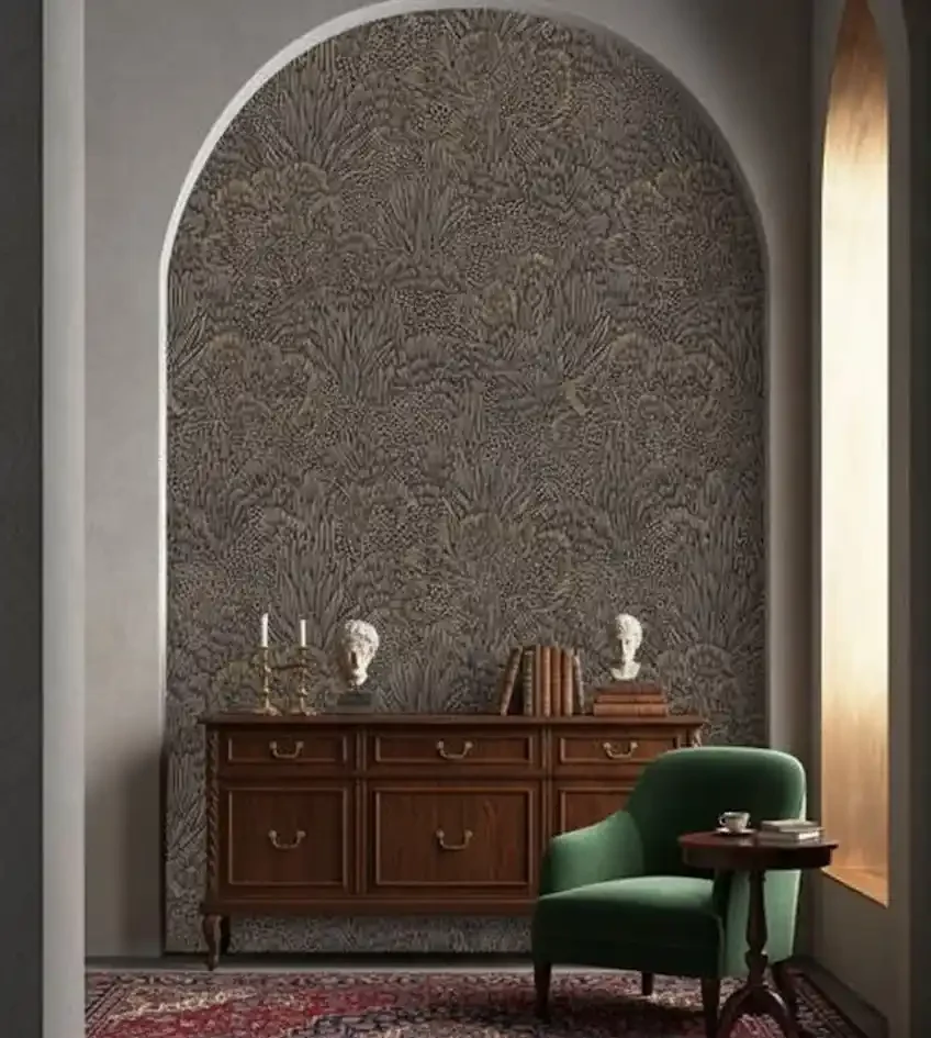 Soft silhouettes of tropical foliage float across a deep black canvas, giving this wallpaper a dramatic yet soothing presence. The contrasting leaves and stems create a lush visual flow that adds personality without feeling too bold. Sized at 1.06 m × 5.2 m (59 sq ft), Black Wallpaper Dubai brings depth and tropical flair to living rooms, dining areas, and feature walls.